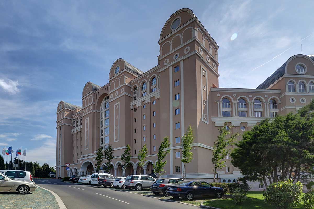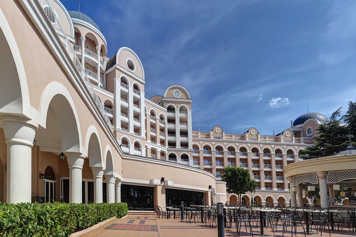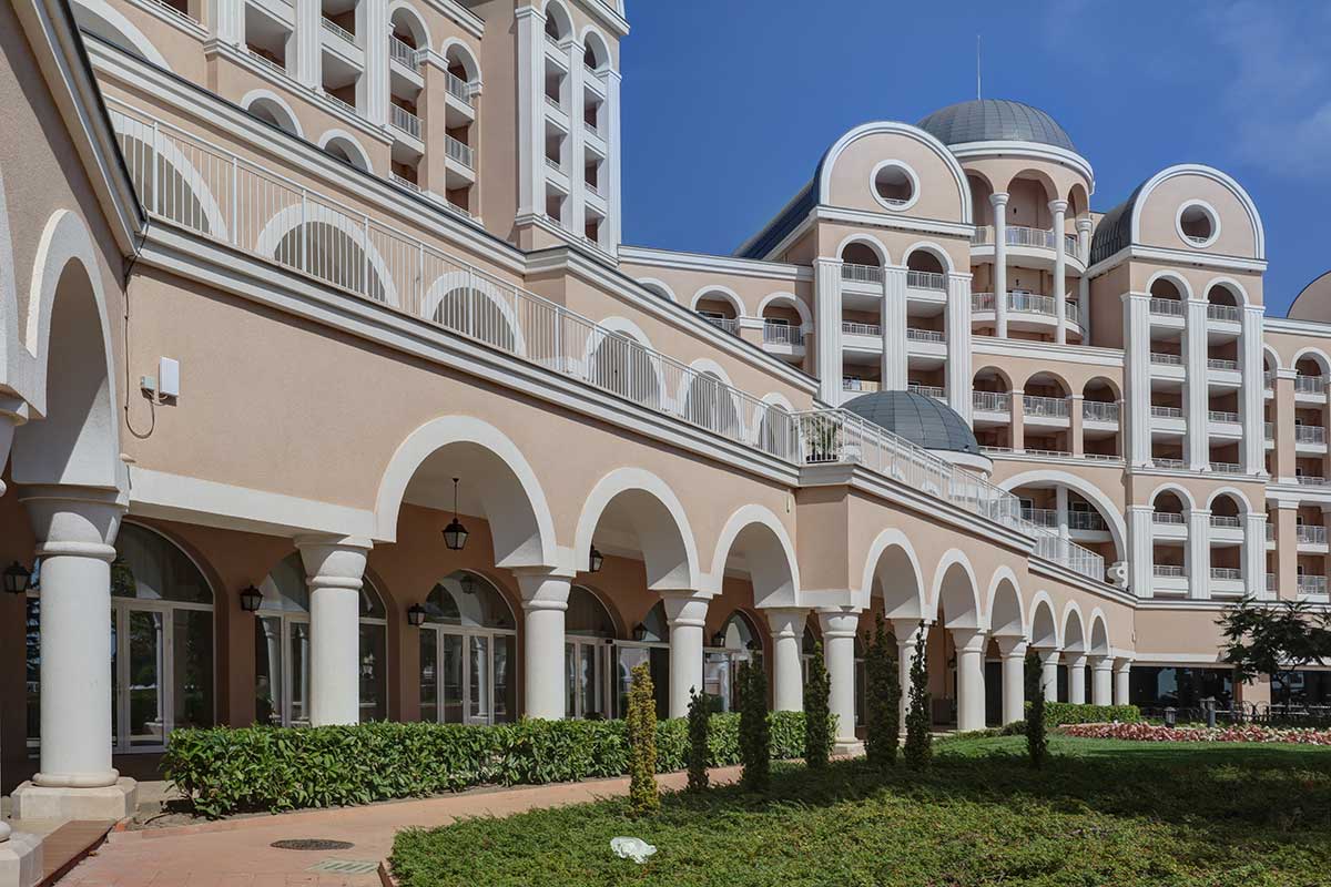 Целият комплекс се състои от 3 основни хотелски групи, като RIU Helios Paradise е първият етап от изграждането, състоящ се от публични зони и сгради, прилежащи технически сгради и съоръжения, обслужващи комплекса. Всяка от основните групи в идейния проект включва основна сграда – хотел и други обслужващи и допълващи функционално сгради. Етап 1 е реализацията на подобект „Клуб Хотел“ основна сграда, разположен в централната част на имота. Клуб хотелът може да функционира напълно самостоятелно от останалия комплекс. Сградата има 13 етажа, като етаж -2 е подземен, етаж - 1 е полувкопан, изцяло отворен към южно разположения вътрешен двор, а етажи от 0 до 10 са надземни. Хотелът разполага с над 600 двойни стаи, близо 100 апартамента, ресторант и клуб за анимации с РЗП 64 750 кв.м и 4 басейна с обща площ 3955 кв.м. Проектът и изпълнението са съобразени с изискванията на наредбата за категоризация за хотел 4 звезди, както и със заданието на Възложителя от международната фирма RIU – Испания, специализирана в изграждане и експлоатация на туристически комплекси от световен мащаб. Това гарантира на сградата функционално зониране, необходимия капацитет и характерен архитектурен образ на хотелите от веригата RIU.