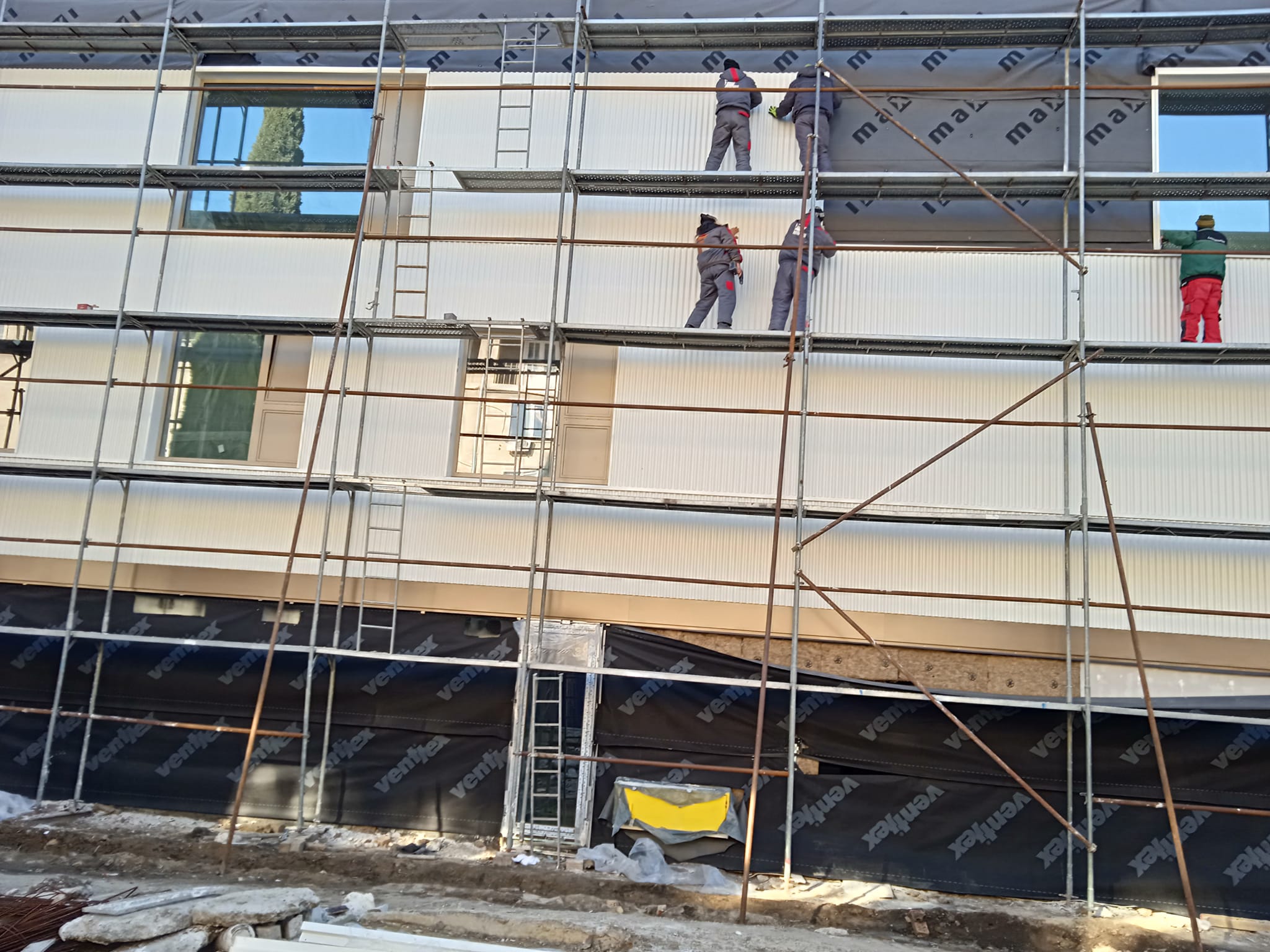 Външните преградни стени са от тухли 38см, които имат термоизолационни свойства. За изолация на плочите, колоните и шайбите се предвижда топлоизолация от минерална вата - 10см. Фасадата е вентилируема с метална облицовка от нископрофилирана поцинкована ламарина на етаж 2 и етаж 3, а на партера е предвидена дъсчена обшивка.