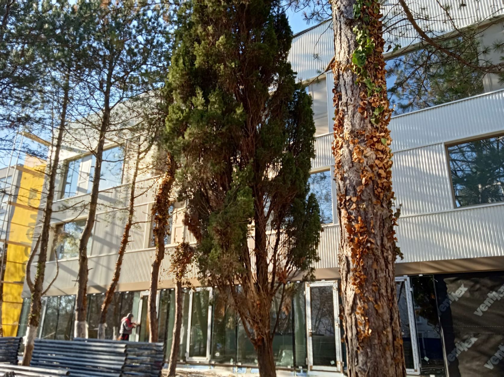 Дограмата на етаж 2 и етаж 3 е дървена, иглолистна, с двоен стъклопакет и с отваряема част с непрозрачен панел от шперплат, третиран с безцветен лак и байц. За партера е избрана алуминиева структурна фасада с двоен стъклопакет и триплексно стъкло.